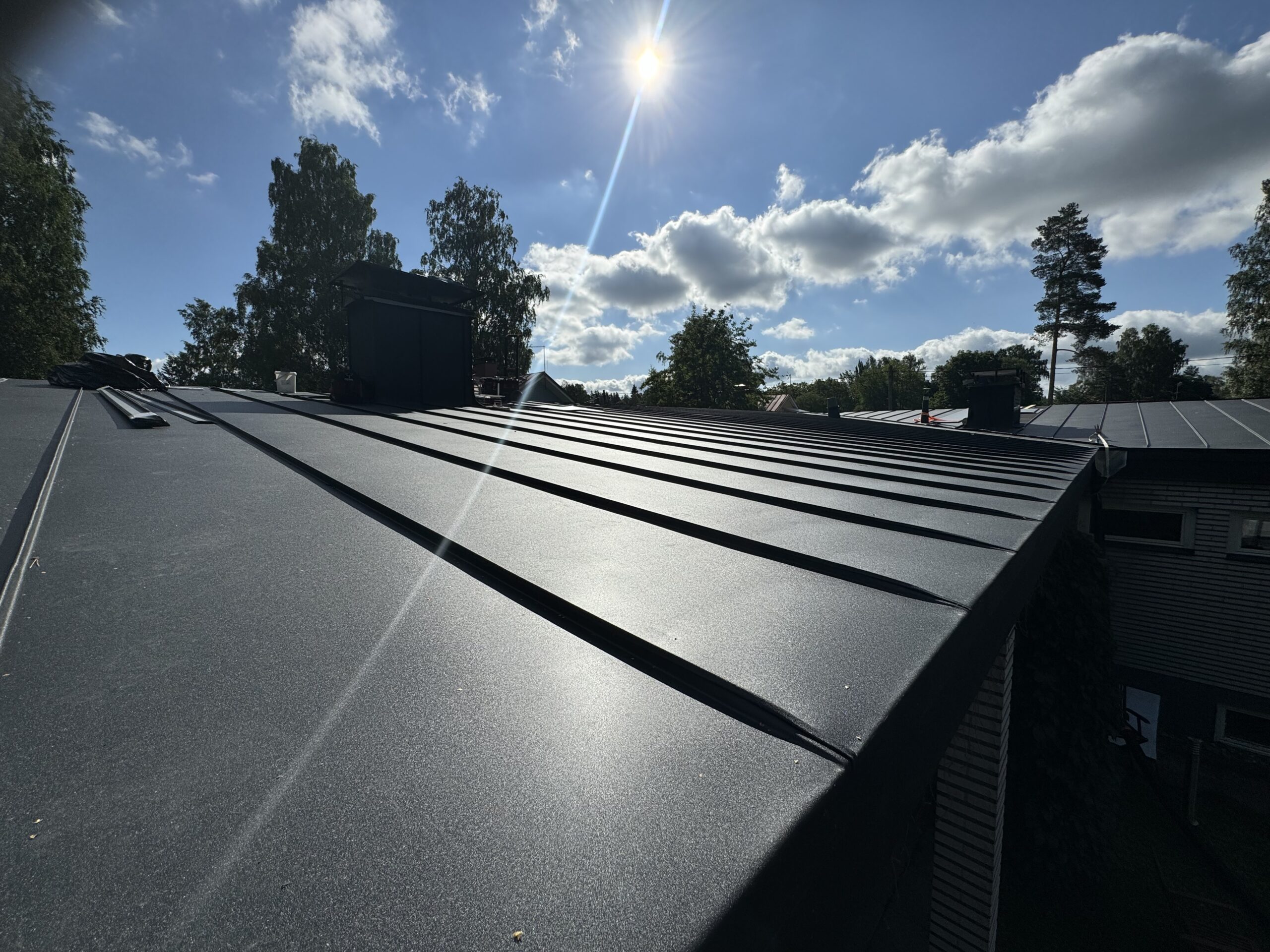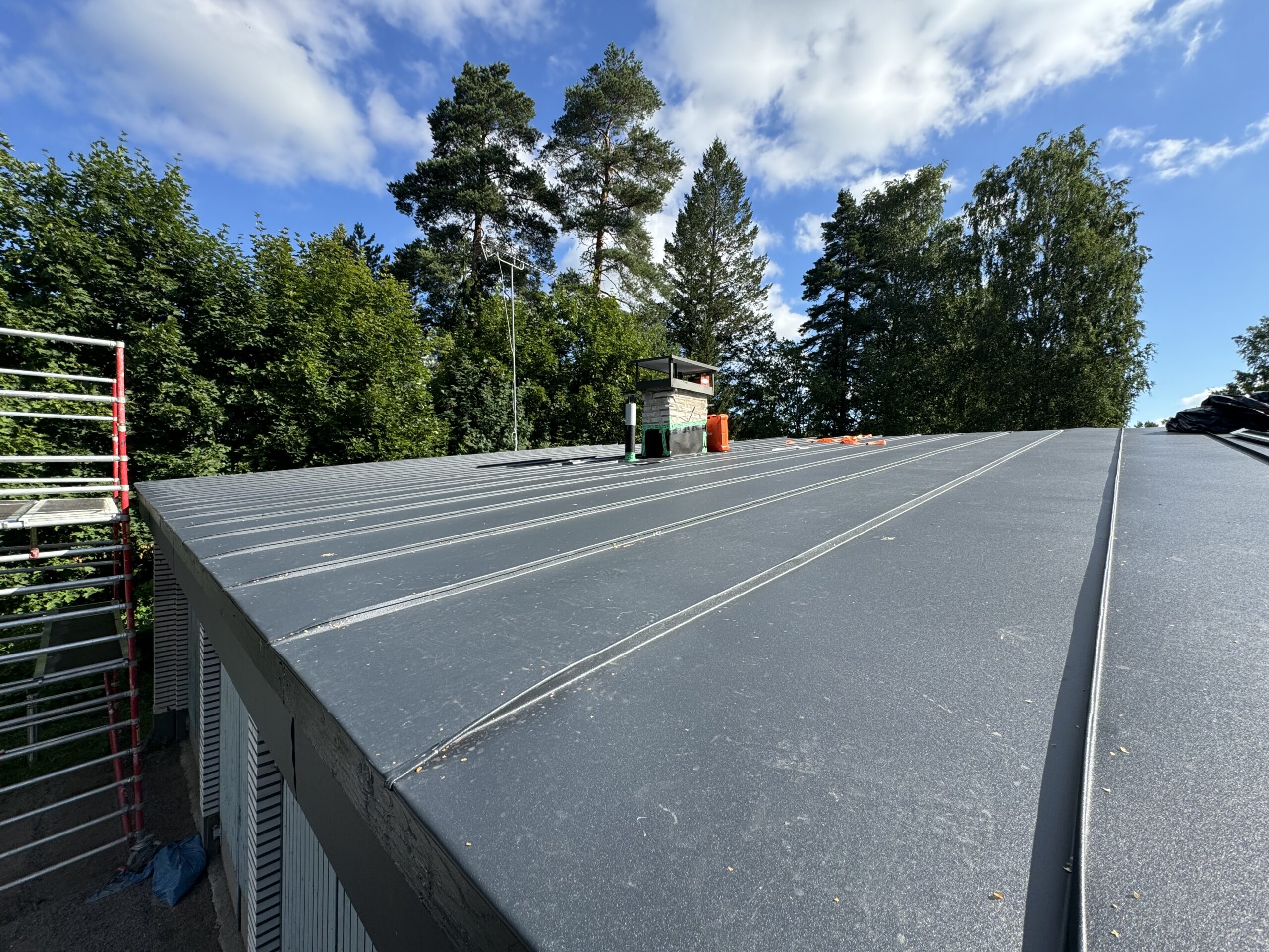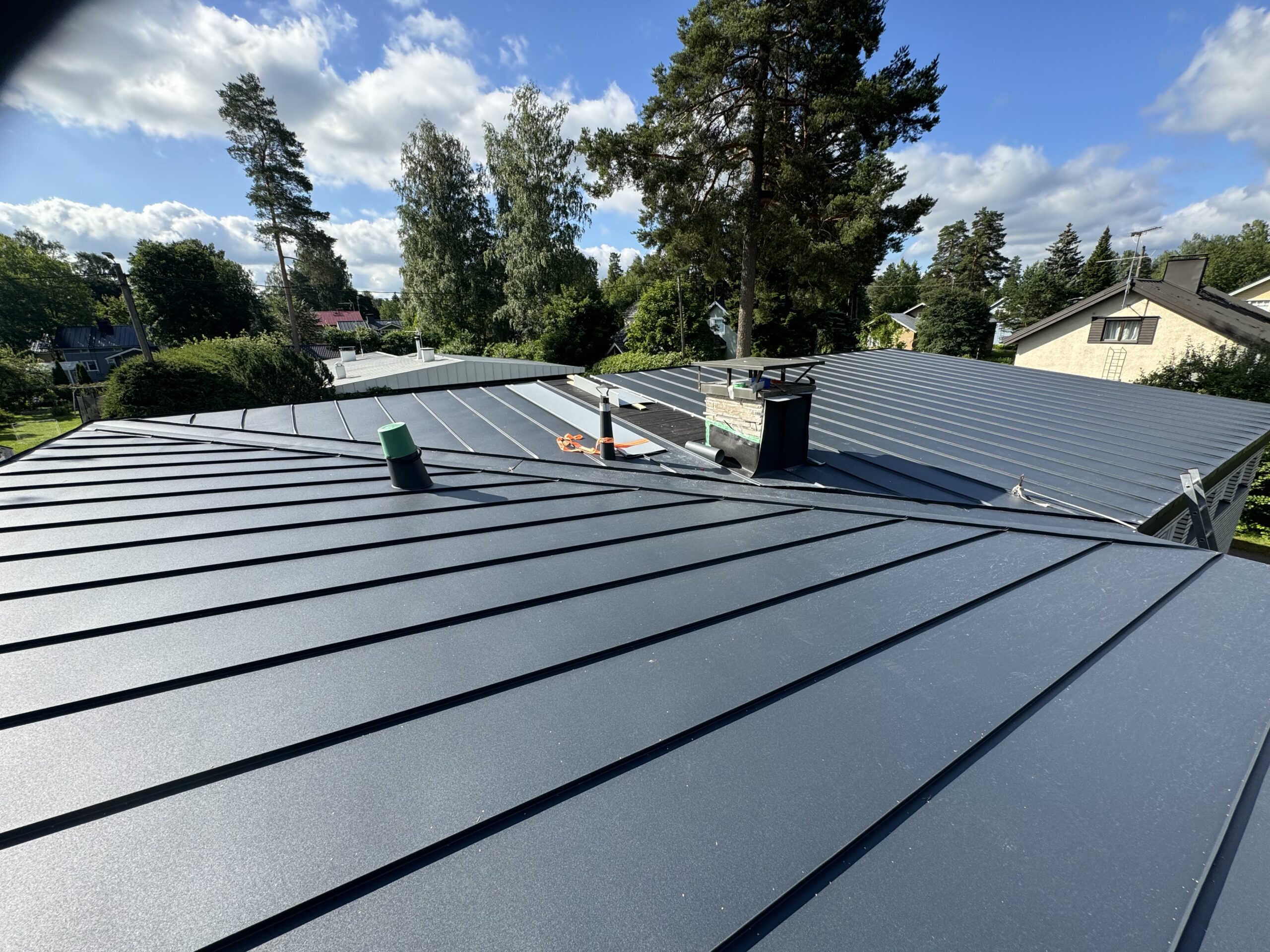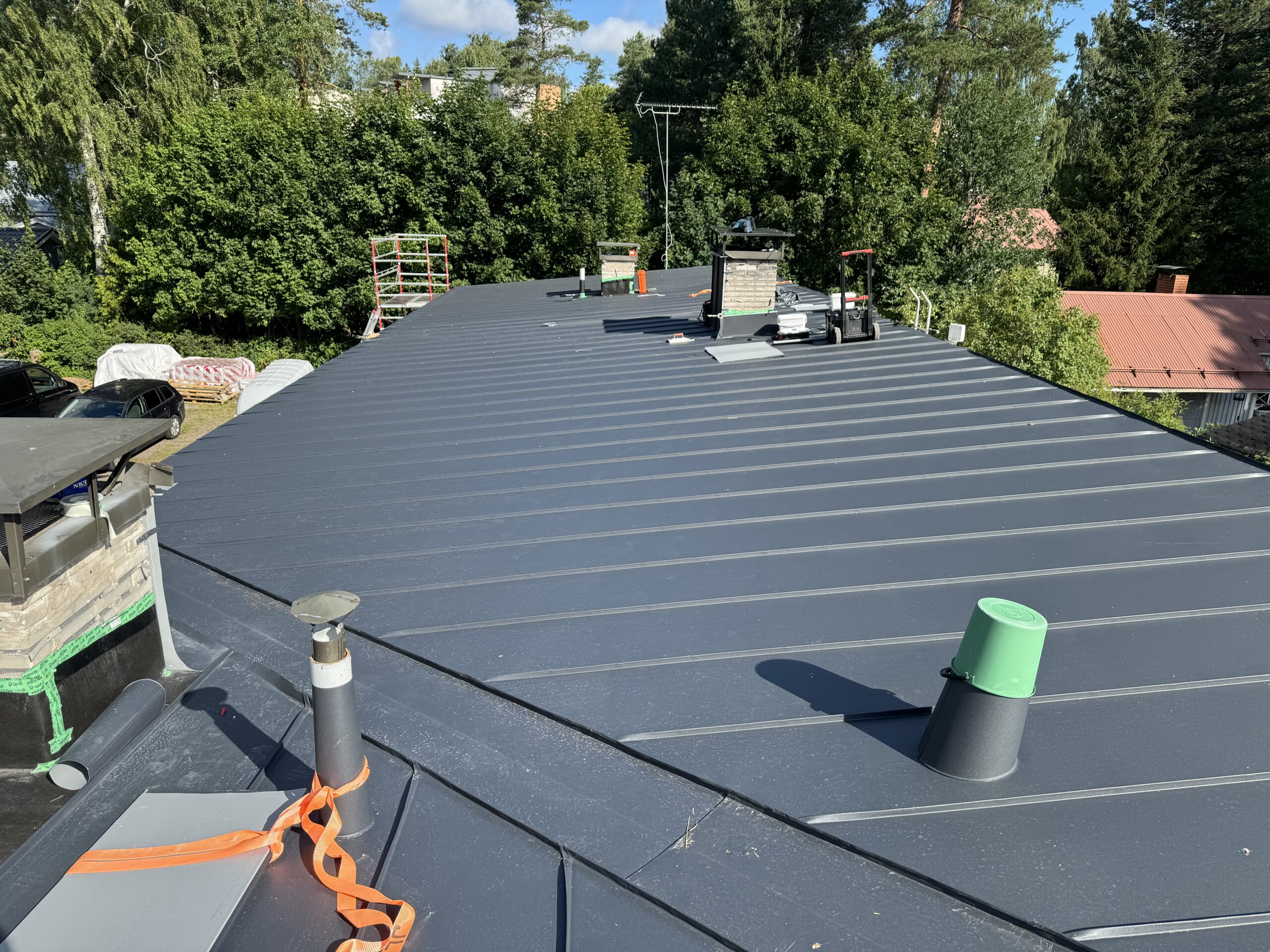 Uudeksi vesikatoksi valittiin konesaumattu peltikatto, joka on tunnettu kestävyydestään ja esteettisestä ulkonäöstään. Konesaumakatto asennettiin huolellisesti, ja kaikki piipunpellitykset sekä muut läpiviennit tehtiin peltisepäntyönä varmistaen, että katto on täysin vesitiivis.