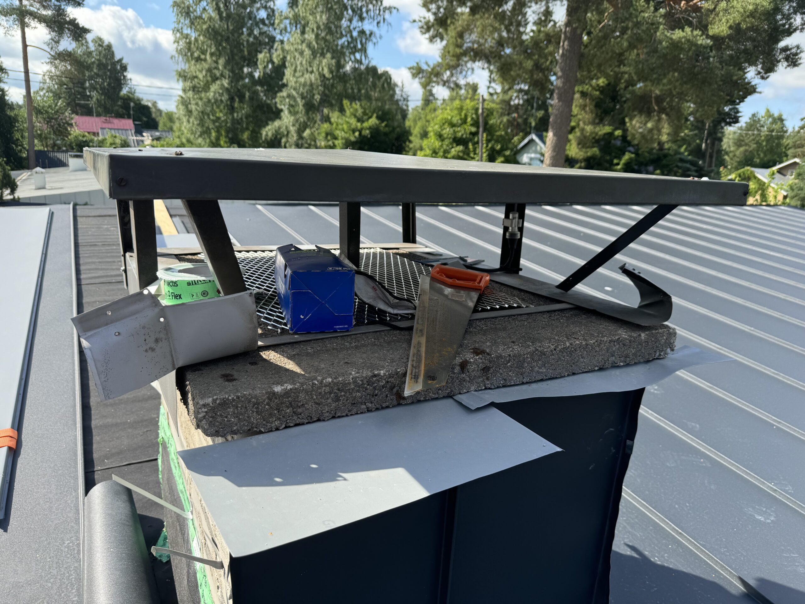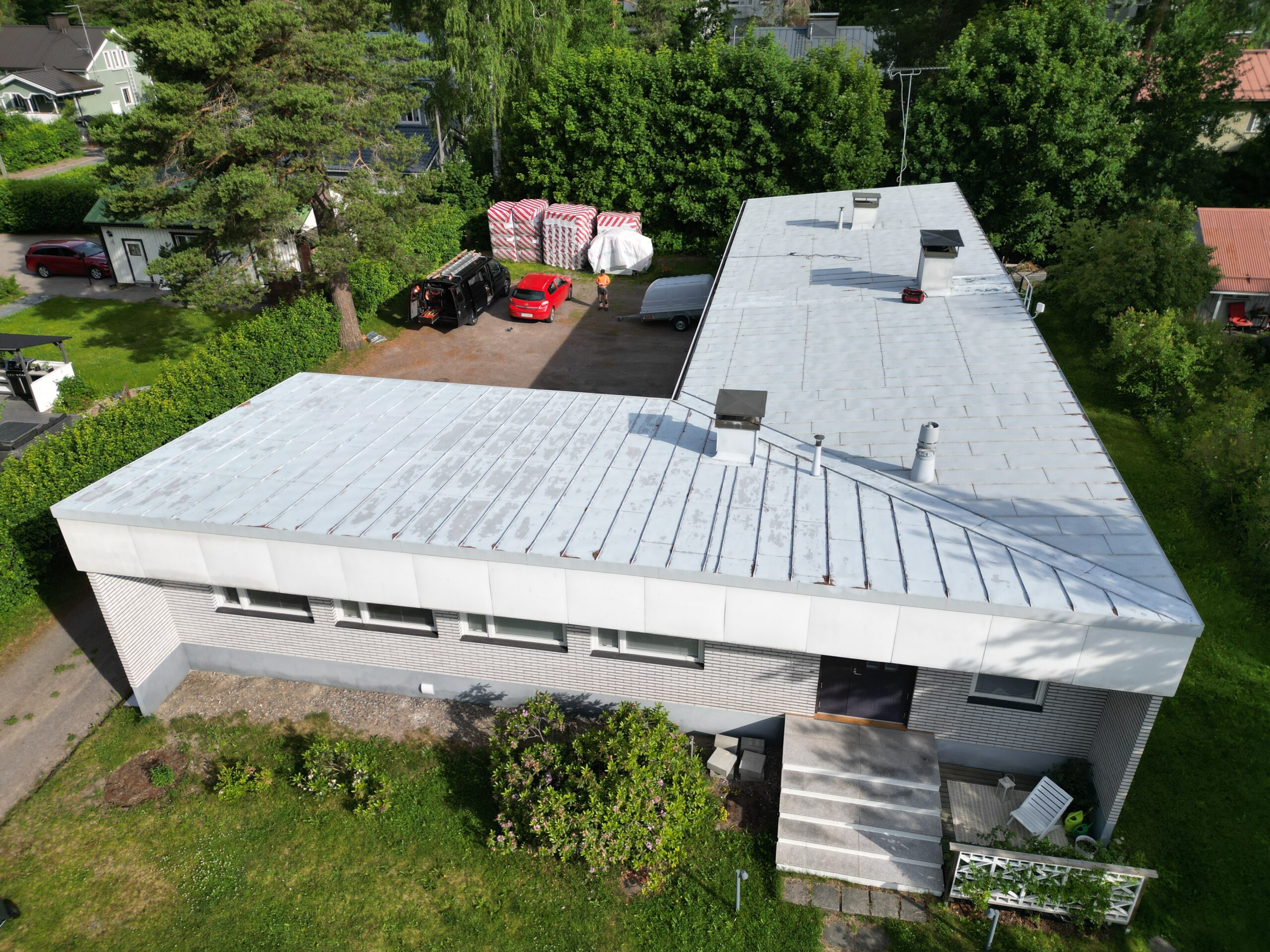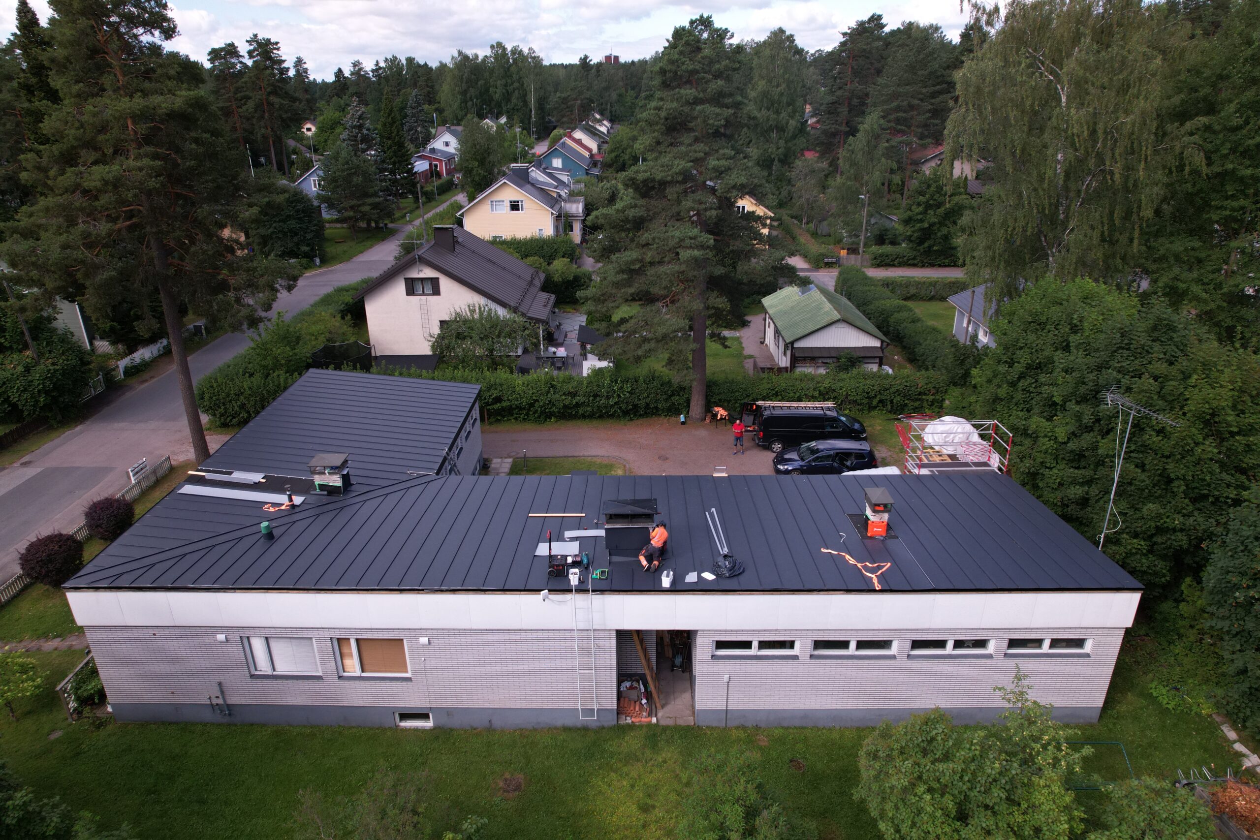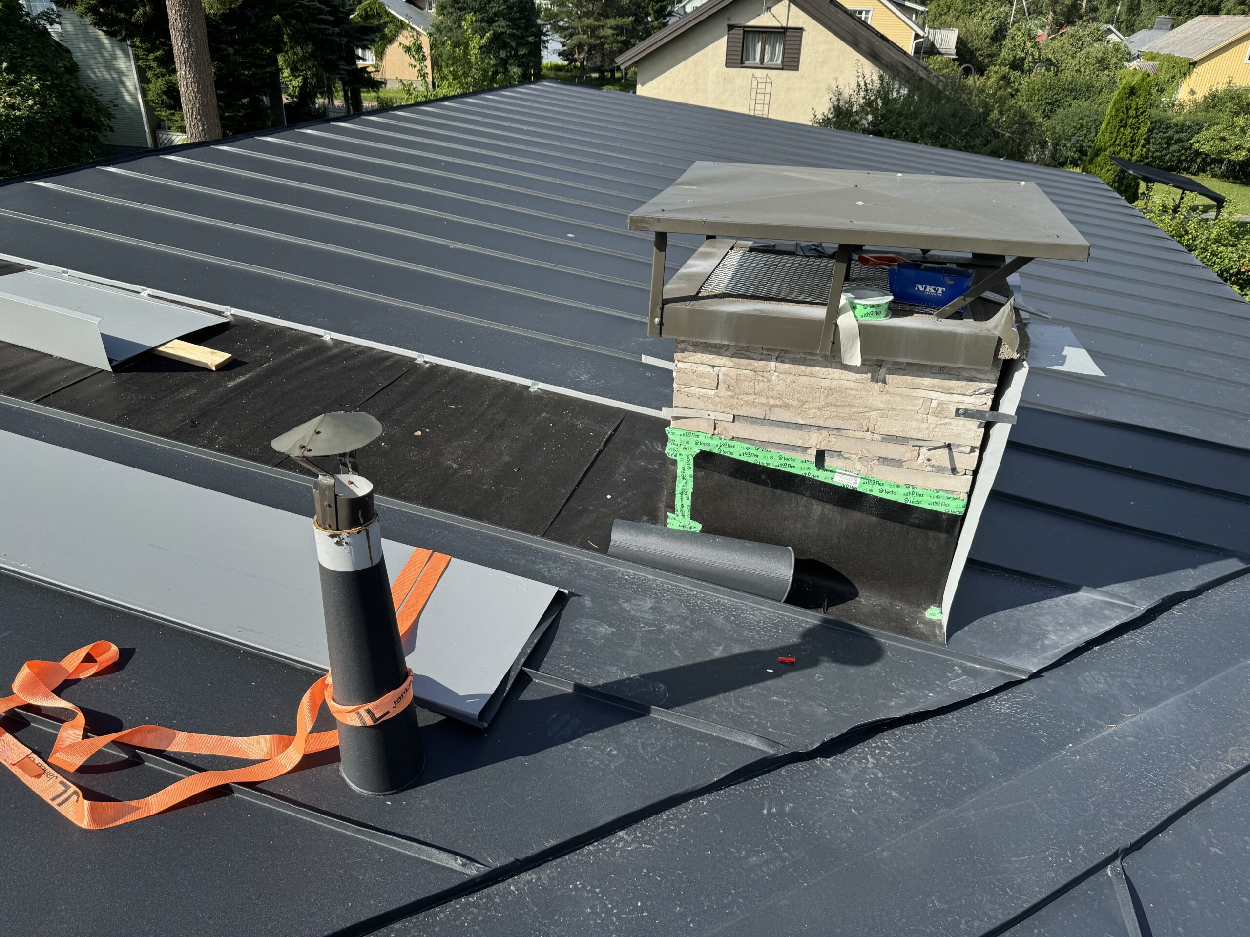 Uudeksi vesikatoksi valittiin konesaumattu peltikatto, joka on tunnettu kestävyydestään ja esteettisestä ulkonäöstään. Konesaumakatto asennettiin huolellisesti, ja kaikki piipunpellitykset sekä muut läpiviennit tehtiin peltisepäntyönä varmistaen, että katto on täysin vesitiivis.