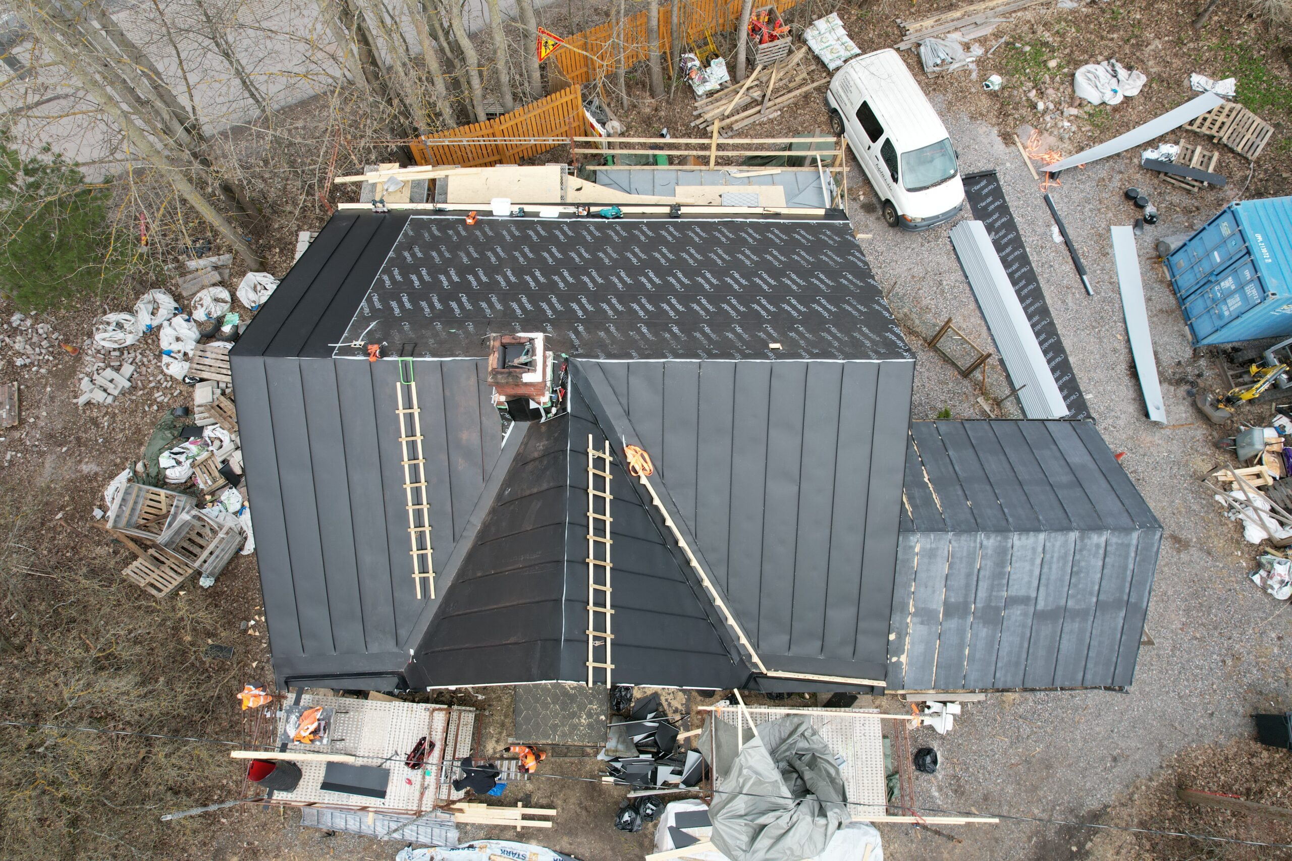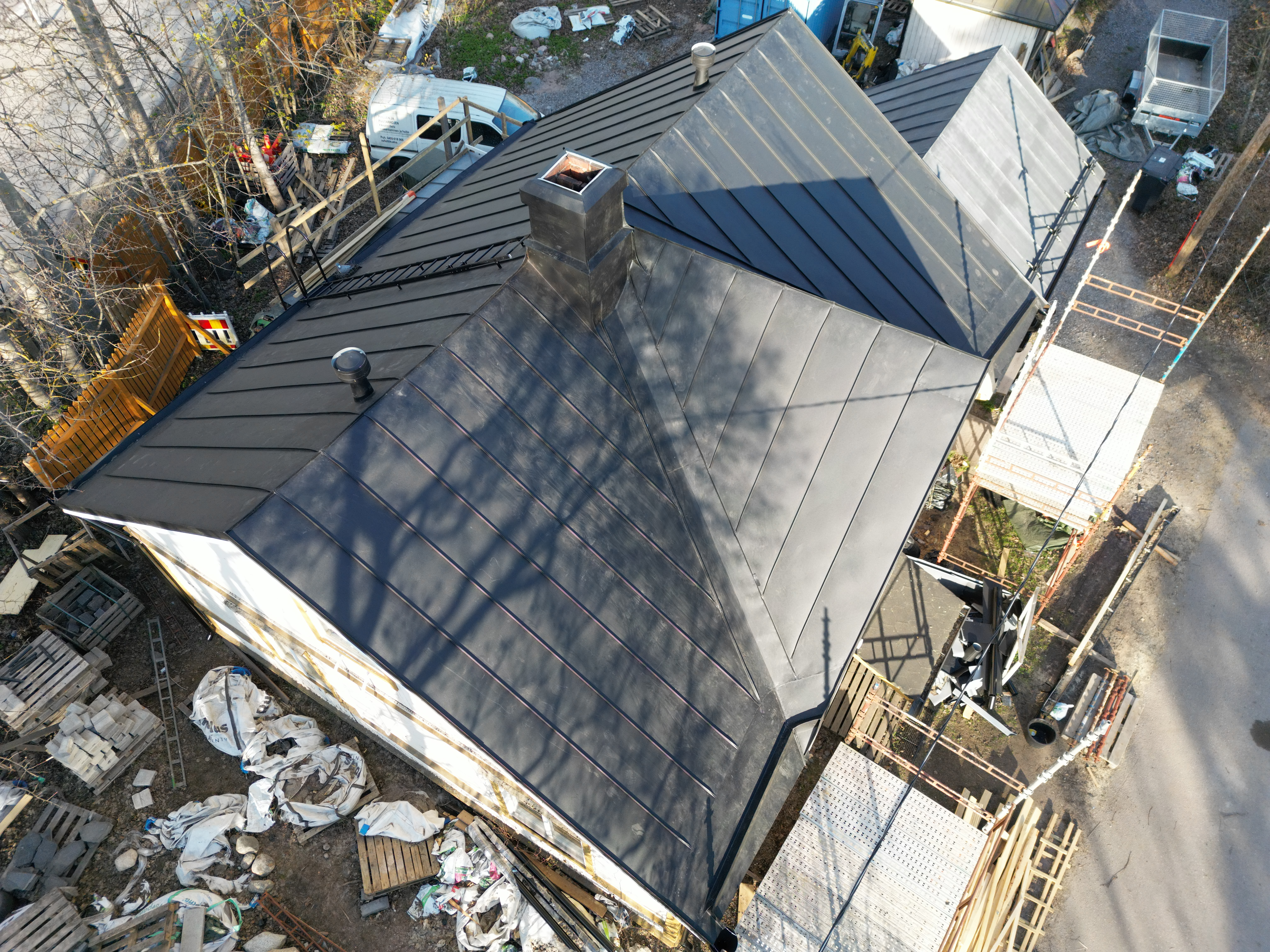 Seuraavaksi katto uusittiin kokonaan konesaumakatolla, joka tarjoaa erinomaisen suojan ja pitkäikäisyyden. Konesaumakatto on tunnettu kestävistä saumoistaan ja kyvystään kestää Suomen vaihtelevia sääolosuhteita. Asennusprosessi suoritettiin huolellisesti ja ammattitaidolla, varmistaen, että uusi katto toimii tehokkaasti ja esteettisesti rakennuksen tärkeänä osana.