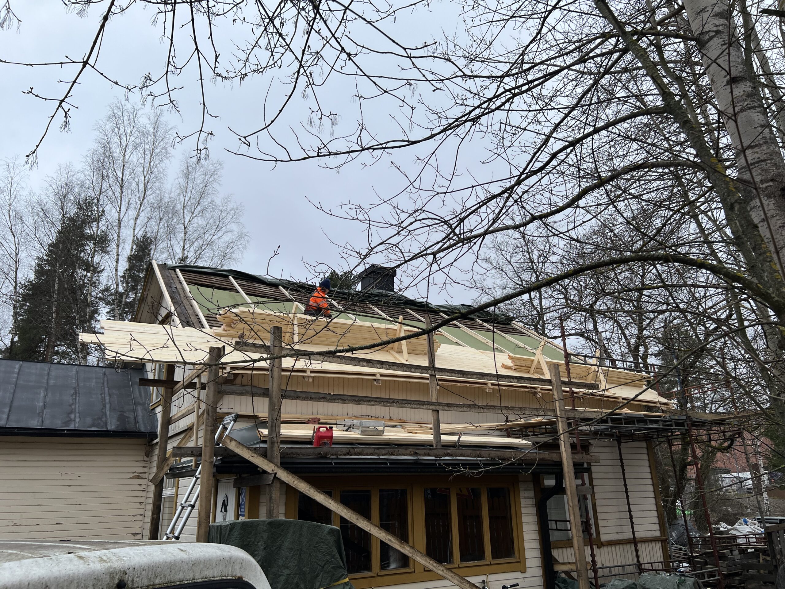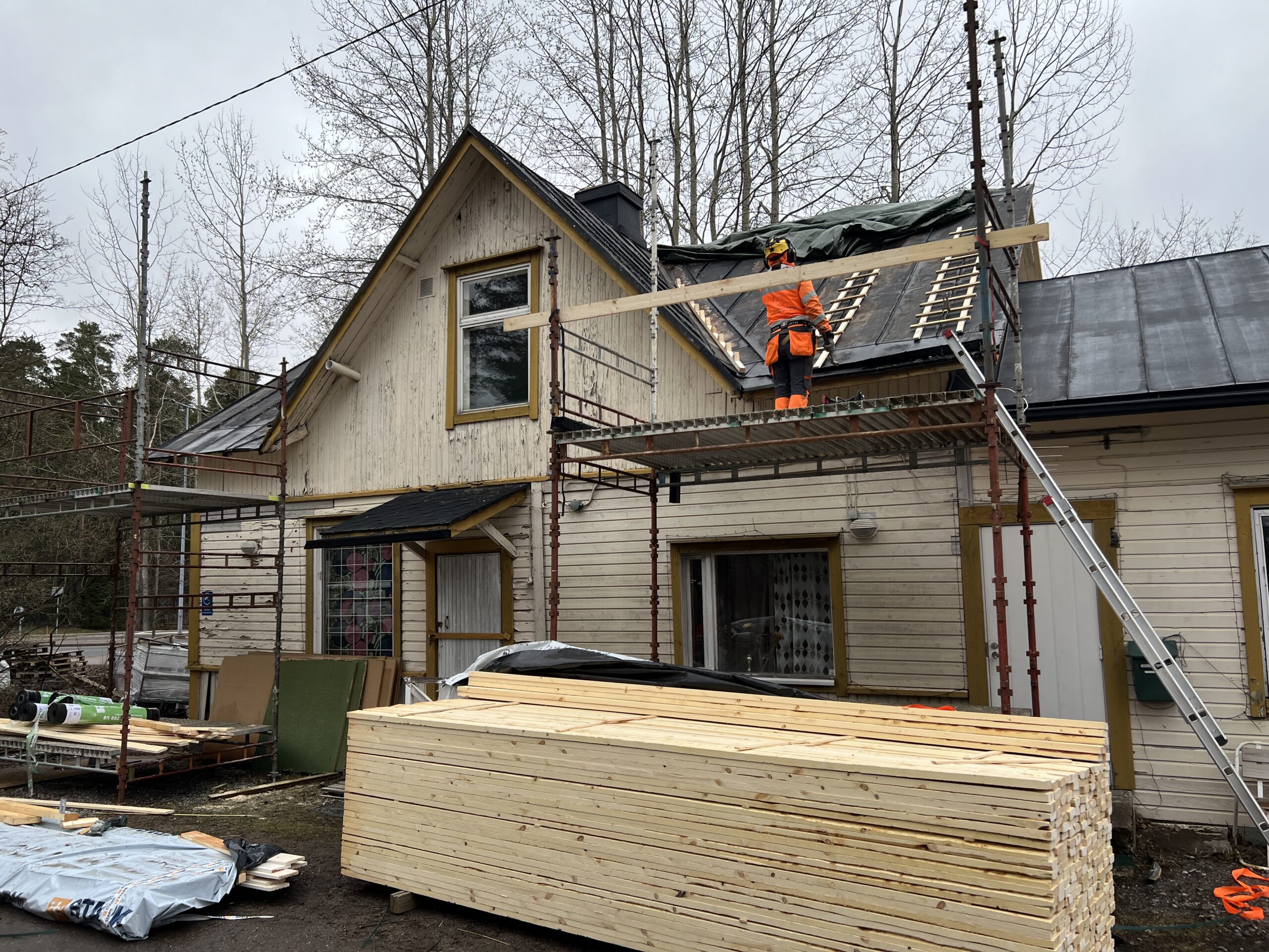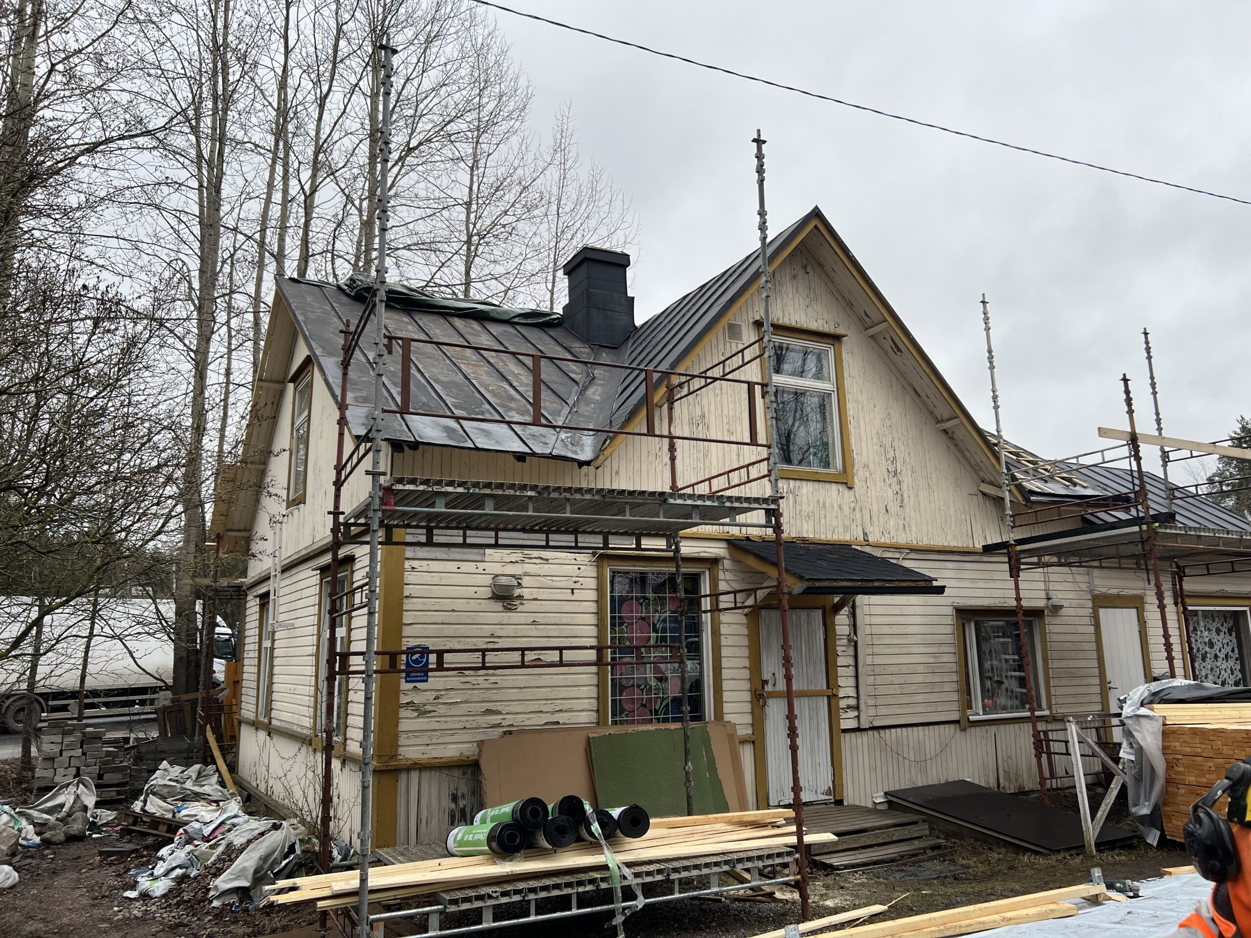 Projekti alkoi vanhan peltikaton huolellisella purkamisella. Poiston yhteydessä havaittiin, että katto tarvitsi rakenteiden vahvistusta, joten vanhat lahot puuosat korvattiin uusilla ja kestävillä materiaaleilla. Kattoa myös korotettiin, ja siihen asennettiin täyslaudoitus sekä aluskermi, joka toimii lisäsuojana kosteutta vastaan.